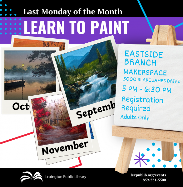 Calling all adults! Join us for a relaxing hour as we follow along with a video and learn to paint. Now meeting every month on the Last Monday of the month. All skill levels invited. Materials will be provided. Registration Encouraged.
