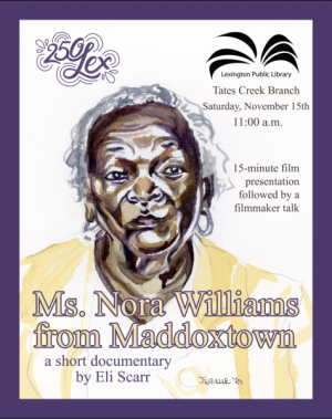 Ms. Nora Williams from Maddoxtown: viewing and discussion with documentarian, Eli Scarr