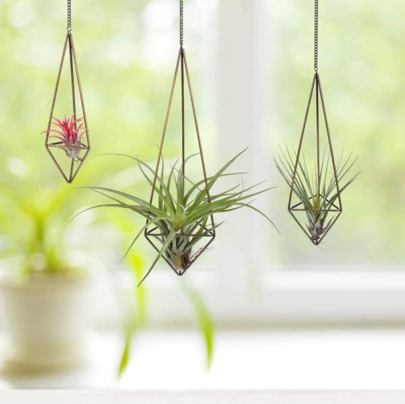 Air plants grow without soil. This means they can be grown just about anywhere indoors that receives bright, indirect light. Place them in trays or specialized hangers, grow them in terrariums, or set them in sea shells or glass globes, vases, or dishes. How they are displayed in the home is often only limited by someone’s creativity!