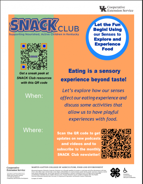 Let's explore how our senses affect our eating experience and discuss some activities that allow us to have playful experiences with food. Parents, caregivers, and children are invited to join the University of Kentucky Cooperative Extension Service to learn how using our senses can make eating a more enjoyable experience. Registration is recommended but not required.