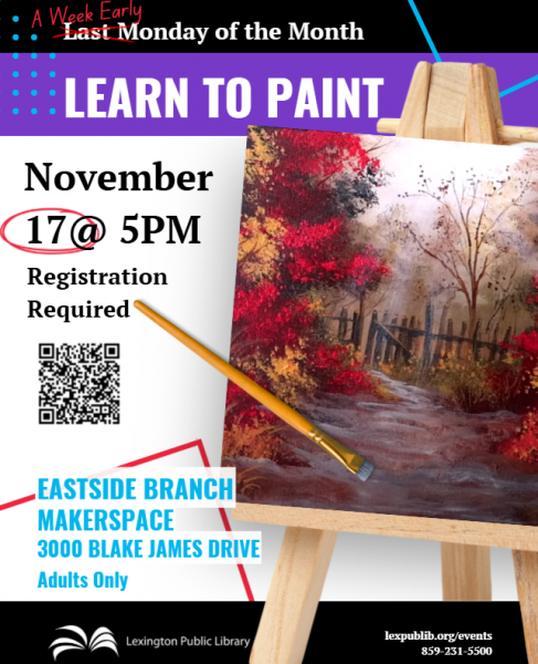 Calling all adults! Join us for a relaxing hour as we follow along with a video and learn to paint. Now meeting every month on the Last Monday of the month. All skill levels invited. Materials will be provided. Registration Encouraged.